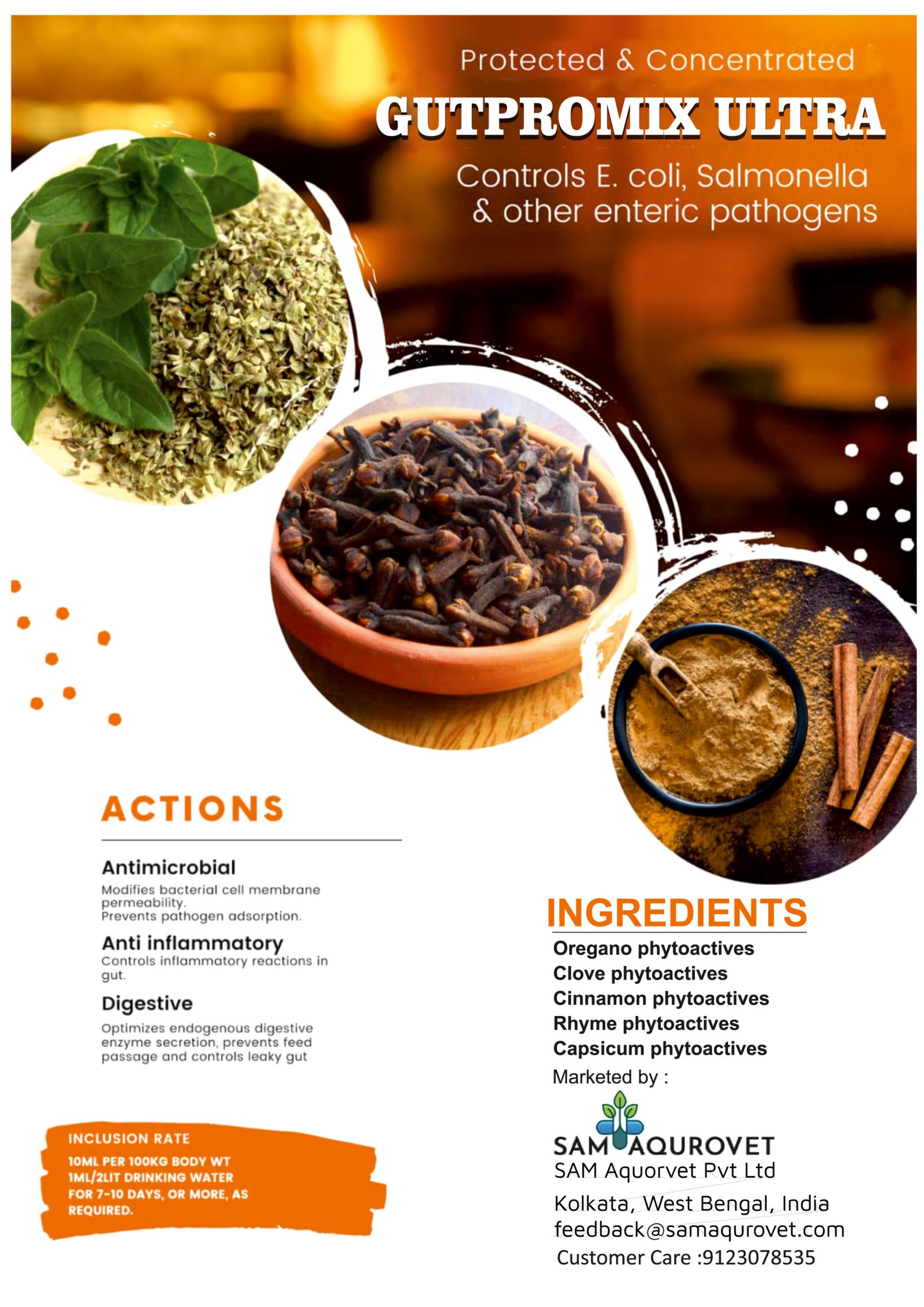 Gutpromix Ultra is a protected and concentrated formulation designed to control E. coli, Salmonella, and other enteric pathogens. It works through three main actions. First, its antimicrobial effect modifies bacterial cell membrane permeability and prevents pathogen adsorption. Second, its anti-inflammatory property helps control inflammatory reactions in the gut. Third, its digestive benefits optimize endogenous digestive enzyme secretion, prevent feed passage, and control leaky gut.